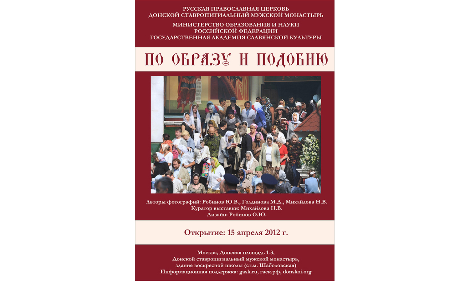 15 апреля 2012 года в Донском ставропигиальном мужском монастыре начала работу фотовыставка «По образу и подобию», приуроченная к празднику Светлой Пасхи Христовой, – выставка портретов тех людей, которые являются носителями православной веры, немногих из тех, без чьего искреннего и живого участия жизнь Церкви была бы невозможна. На выставке представлены портреты священников и иерархов Русской Православной Церкви, монахов, трудников монастырей, прихожан, русских учёных – деятелей в области древнерусского искусства и реставрации, подвижников славянского просвещения.