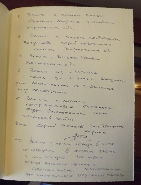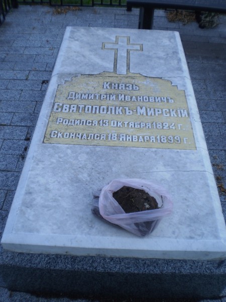 И с могил династии князей Святополк-Мирских мы тоже привезли землю, потому что род князей Святополк-Мирских, которые похоронены в Гиевке (район г Люботин) участвовал во многих войнах, доблестно служил России. Пётр Дмитриевич Святополк-Мирский был министром внутренних дел в императорской России.