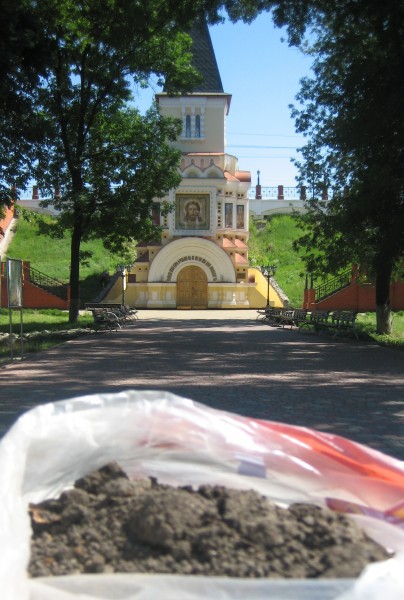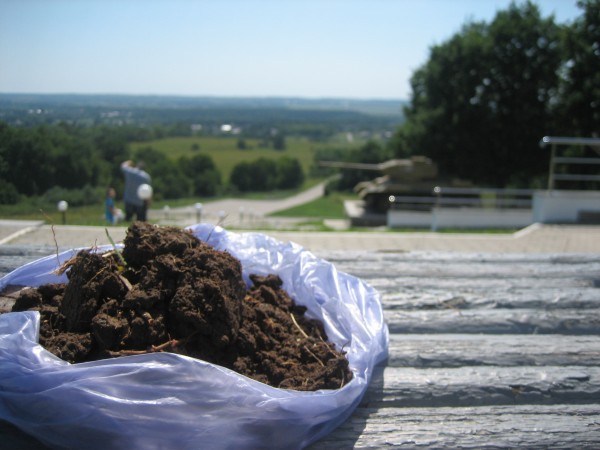 Здесь у нас еще земля с памятных мест Великой Отечественной Войны. Харьков был освобожден 23 августа, а освобождение города началось с битвы за высоту, которая теперь носит имя лейтенанта Петрищева.