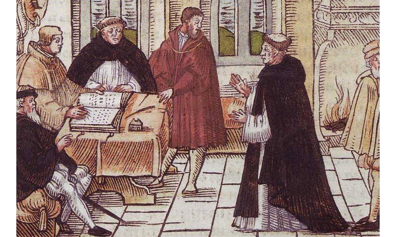 Luther vor Cajetan kolorierter Holzschnitt 1557